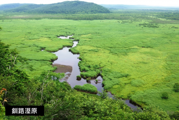 【釧路濕原瞭望台】釧路濕原位於北海道東部的釧路市北面,是日本最大的濕原,孕育著北海道鹿(蝦夷鹿),白尾雕等2000 種動植物,寒冬時節還會有日本國寶丹頂鶴的光臨,園內所有生、植物已列入日本政府保育。周圍的丘陵上設立瞭望台,讓遊客可以360度全方位環視濕原野。