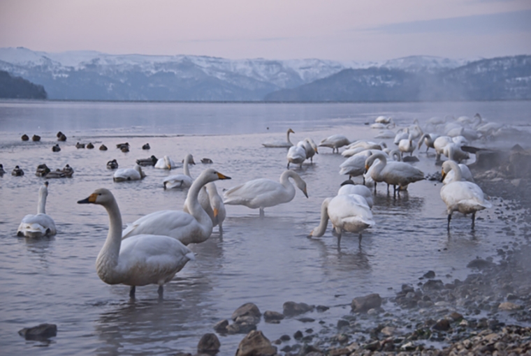 【屈斜路湖】阿寒三湖之一,為日本最大的破火山口湖,面積約80k㎡。周邊屬於千島火山地帶,湖畔接連著砂泉,美景連續,令人目不瑕給;亦可在湖岸旁長椅上體驗一邊挖砂洞一邊泡足浴的樂趣。