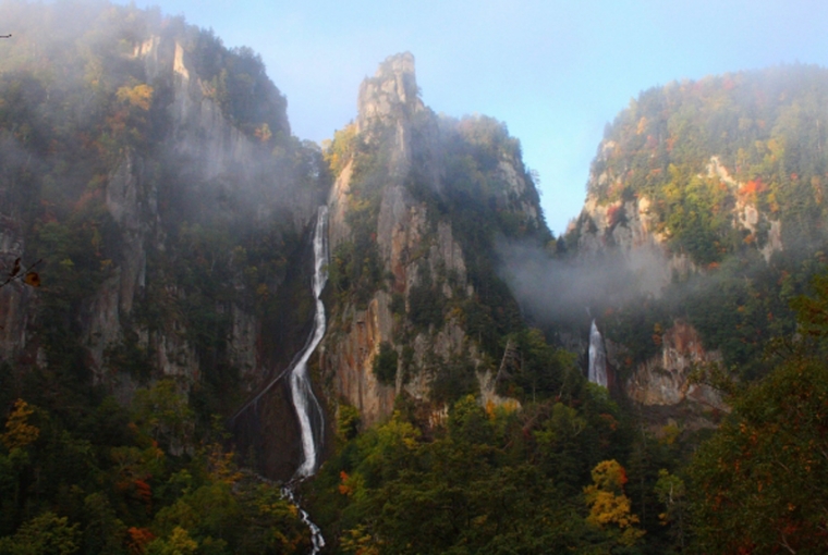 【銀河、流星瀑布】流星瀑布是從90公尺高的斷崖上俯衝傾瀉而下,宛如千軍萬馬奔騰一般。它的左邊是120公尺的銀河瀑布,像拉著銀絲般的水流姿態。其懸崖斷壁間衝瀉而下細水有如夫婦般之繾綣絲情,令人羨慕。這兩個瀑布被選為是日本百選瀑布也被合稱為夫婦瀑布。