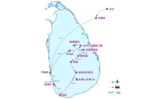 參考飛行時間:桃園→(約5小時)吉隆坡→(約3.5小時)可倫坡